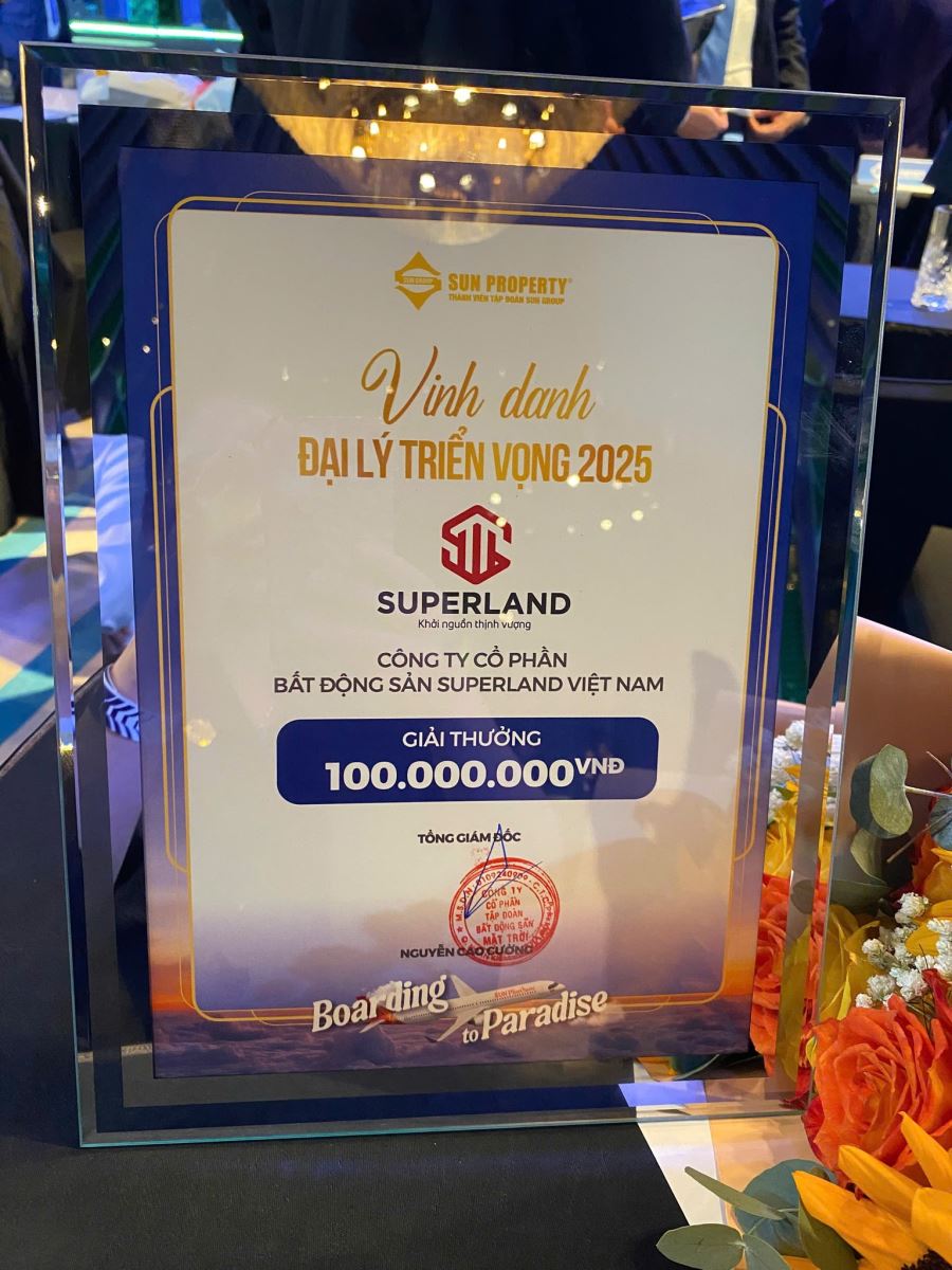 Trong Lễ Vinh Danh Các Đối Tác Năm 2025 của Sun Property, SuperLand Việt Nam vinh dự được xướng tên ở hạng mục Đại Lý Triển Vọng 2025. Đây là một thành tựu đáng tự hào, không chỉ phản ánh sự nỗ lực không ngừng nghỉ của đội ngũ SuperLand mà còn là minh chứng cho sự phát triển vững mạnh và sự khẳng định của công ty trên thị trường bất động sản cao cấp. Việc đạt được danh hiệu này là sự ghi nhận xứng đáng về kết quả kinh doanh và những đóng góp tích cực của SuperLand trong việc phân phối các dự án bất động sản cao cấp của Sun Property. Đồng thời, đây cũng là một dấu ấn quan trọng cho năng lực triển khai dự án, tư duy chiến lược và tinh thần đồng hành lâu dài mà SuperLand đã xây dựng trong suốt quá trình hợp tác với Sun Property.